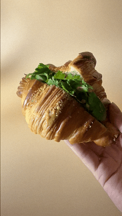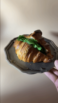 焦糖花生香菜可頌以法國Viron T55麵粉與ÉCHIRÉ艾許奶油製成千層酥皮,包入手炒焦糖提香的鹽味顆粒花生醬與滿滿新鮮香菜,讓濃厚花生與草本清爽在口中正面衝撞,是香菜控必收的獵奇系可頌。
