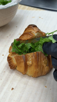 キャラメルピーナッツ香菜クロワッサンは、フランス産Viron T55小麦粉とエシレバターのサクサク生地に、焦がしキャラメルで香りを引き立てた塩味つぶつぶピーナッツバターとたっぷりの香菜を包み込んだ、一口でクセになるチャレンジ系クロワッサンです。