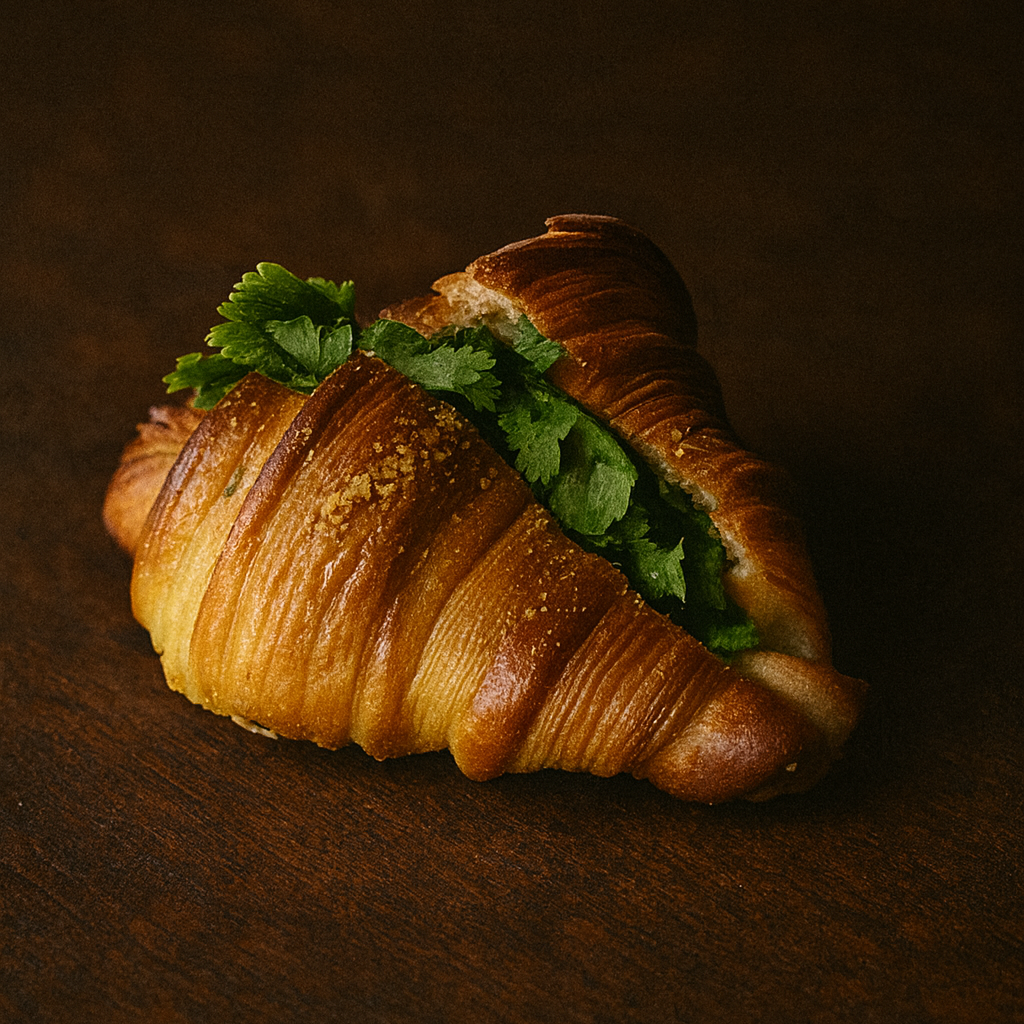 Caramel Peanut Cilantro Croissant uses French Viron T55 flour and ÉCHIRÉ butter for ultra-flaky layers, filled with salted crunchy peanut butter boosted by caramel aroma and plenty of fresh cilantro. Bold nutty richness collides with herbal freshness in every bite, perfect for adventurous cilantro lovers.